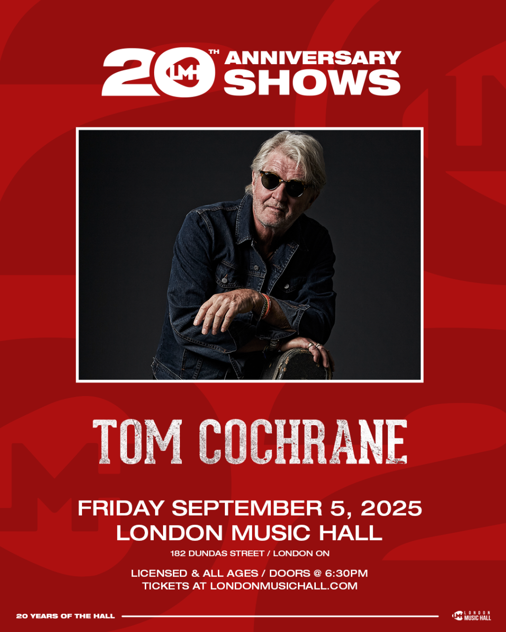 Tom Cochrane at London Music Hall Where London Music Hall, London, ON Map When Sep 05/25 07:00 PM - Sep 05/25 11:00 PM Age All Website https://londonmusichall.com/ TOM COCHRANE LONDON MUSIC HALL FRIDAY SEPTEMBER 5, 2025 PART OF THE 20TH ANNIVERSARY SERIES CLICK HERE FOR RADIO PRE-SALE – JUNE 19 FROM 10AM-10PM GENERAL ON SLAE BEGINS JUNE 20 AT 10AM
