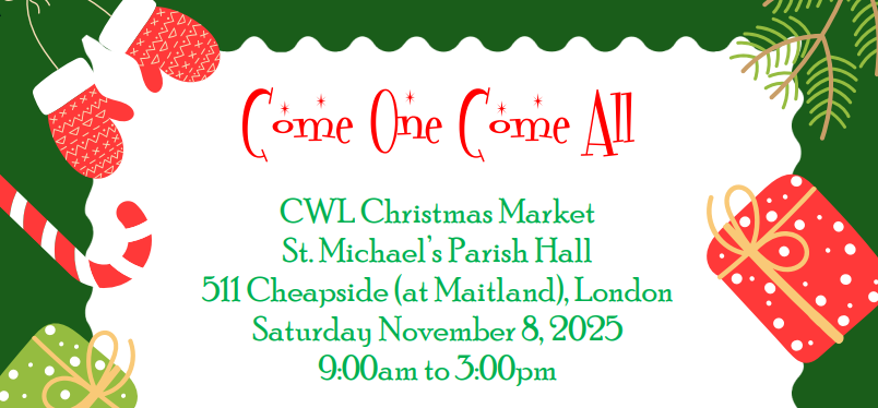 St. Michael’s CWL (511 Cheapside at Maitland) is hosting a sale by parish crafters Nov.8, 2025, 9am-3pm in the parish hall. One of the best Christmas Markets in London! Get in the Christmas spirit with unique crafted gifts and prizes, a Draw Table, Silent Auction and more! When your shopping is done, enjoy a snack at our Christmas Cafe. No charge to enter, cash only for purchases. Proceeds to Social outreach programs.