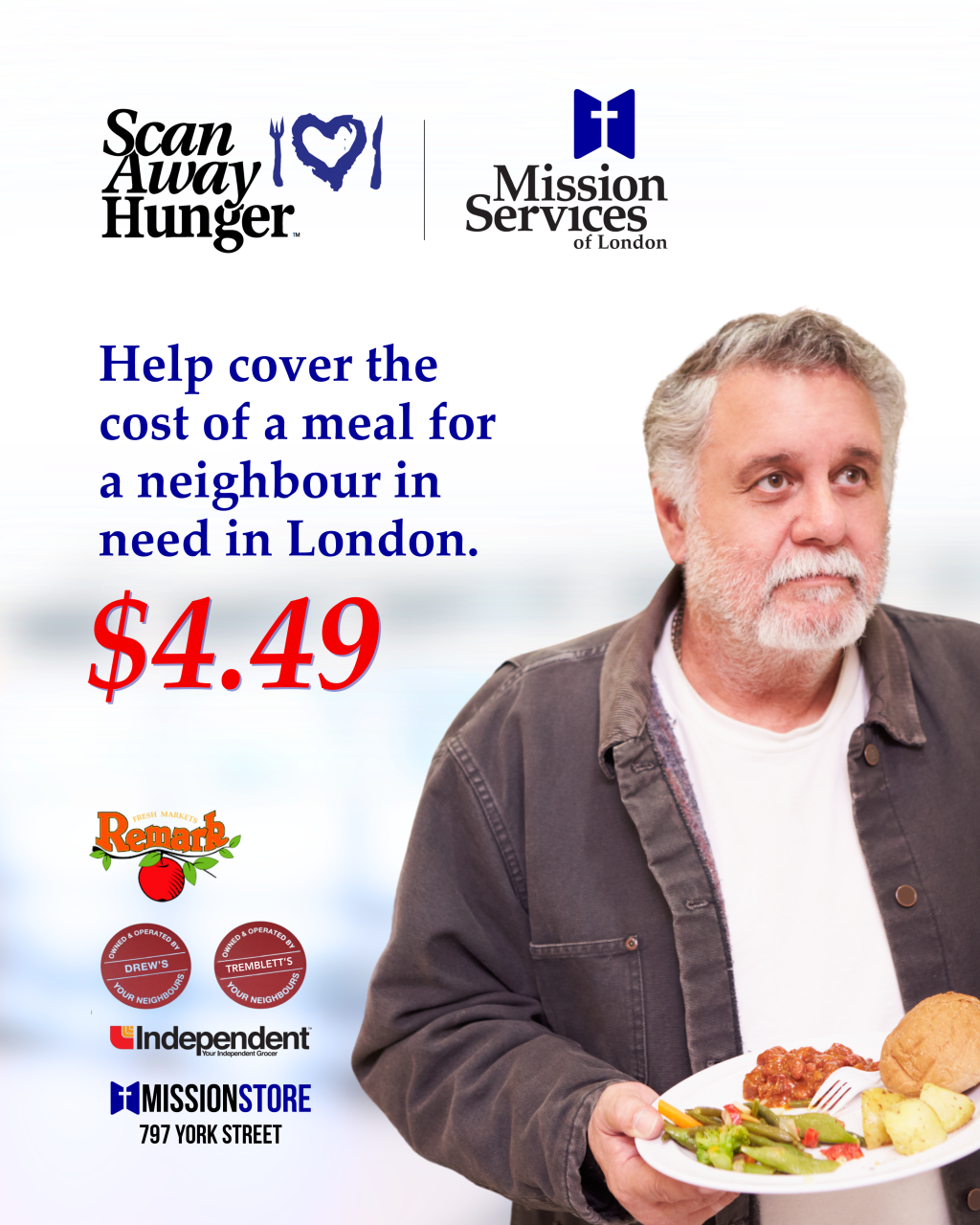 β’ Mission Services of London is once again hosting Scan Away Hunger, their annual campaign to help cover the cost of meals for people in need β men, women, and children staying in local emergency shelters or addiction recovery programs.
